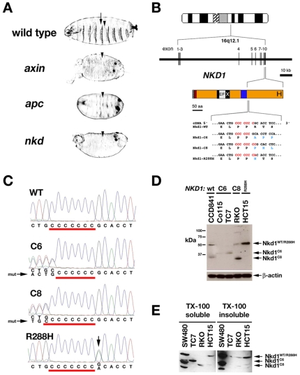 Figure 1. Nkd mutations in fly and human.(A) Wild-type, axin, apc, and nkd Drosophila cuticles. Wild type has alternating denticle bands (arrow) and naked cuticle (arrowhead), with each mutant lacking denticle bands. (B) NKD1 locus has 10 exons. Nkd1 schematic (orange) includes N-terminal myristoylation, EFX, 30aa (blue), and carboxy-terminal His-rich motifs. Exon 10 sequences around poly-(C) tracts (red) above native (black) and mutant (blue) residues are shown. (C) NKD1 electropherograms showing wild-type (WT) poly-(C)7, cell line TC7 with C-deletion (C6), cell line RKO with C-insertion (C8), and cell line HCT15 with G>A mutation (arrow) 3′ of poly-(C)7. (D, E) α-Nkd1 blots of whole cell extracts (D) and Triton X-100 soluble and insoluble fractions (E) from cell lines with indicated NKD1 mutation. Arrows designate Nkd1 proteins. β-actin is loading control in D. CCD841 has full length Nkd1, with a minor degradation product at ∼35 kDa also seen with transfected NKD1 (e.g. Fig. 1E, 5C), whereas SW480 with more abundant but wild-type Nkd1 has several degradation products.