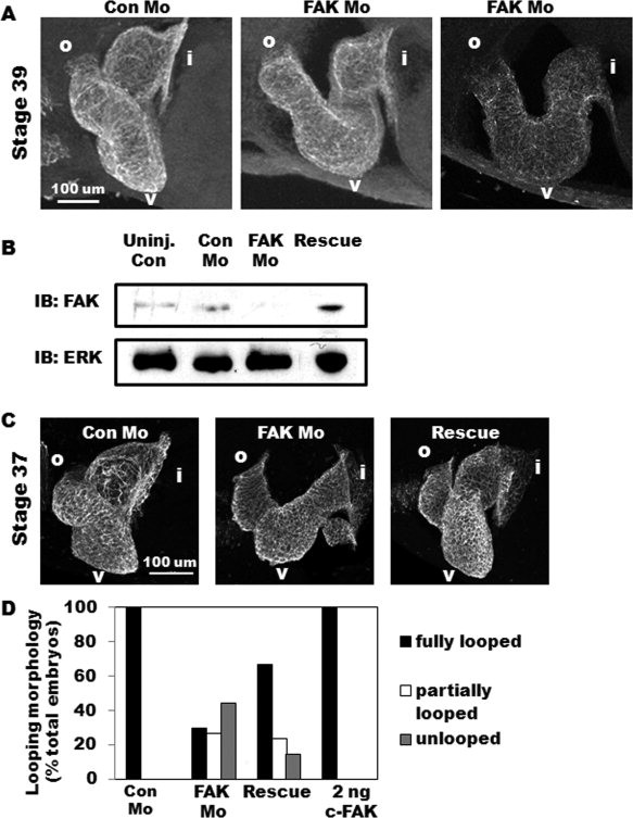 Focal adhesion kinase (FAK) is a critical mediator of matrix- and growth factor-induced signaling during development. Myocyte-restricted FAK deletion in mid-gestation mice results in impaired ventricular septation and cardiac compaction. However, whether FAK regulates early cardiogenic steps remains unknown. To explore a role for FAK in multi-chambered heart formation, we utilized anti-sense morpholinos to deplete FAK in Xenopus laevis. Xenopus FAK morphants exhibited impaired cardiogenesis, pronounced pericardial edema, and lethality by tadpole stages. Spatial-temporal assessment of cardiac marker gene expression revealed that FAK was not necessary for midline migration, differentiation, fusion of cardiac precursors, or linear heart tube formation. However, myocyte proliferation was significantly reduced in FAK morphant heart tubes and these tubes failed to undergo proper looping morphogenesis. Collectively our data imply that FAK plays an essential role in chamber outgrowth and looping morphogenesis likely stimulated by fibroblast growth factors (and possibly other) cardiotrophic factors.