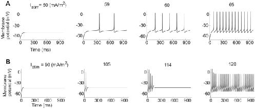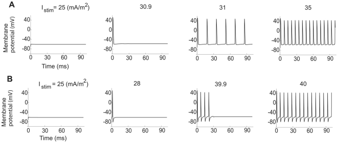 Figure 9. Exclusively Type 2 dynamics in the myelinated axon model.The time-course of the membrane voltage with increasing steady current for low and high K channel densities. (A) = 300 µm/s and = 0 µm/s. The onset frequency is 59Hz. (B) = 300 µm/s and = 40 µm/s. The onset frequency is 139Hz.