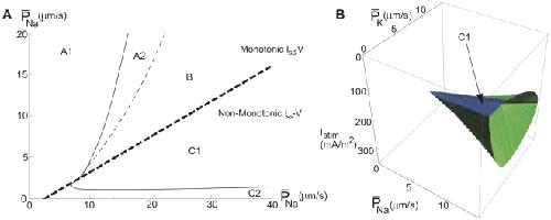 Figure 2. Oscillation maps for the hippocampal neuron model.(A) Regions in the − plane associated with different threshold dynamics. Oscillations occur within the area defined by the continuous line. Double-limit cycle bifurcations in the A2 region, Andronov-Hopf bifurcations (together with double-limit cycle bifurcations) in the B region and saddle-node bifurcations in the C1 region. The bold dashed line indicates the border for channel densities associated with three stationary potentials. The map is a projection of a curved plane in the −−Istim space (on which the oscillation starts) to the − plane. (B) The corresponding three-dimensional map, showing the volume associated with oscillations in the −−Istim space. Oscillations occur in the volume defined by blue and green surfaces. The green surface area represents double-limit cycle bifurcations and the blue area saddle-node bifurcations (SNICs).
