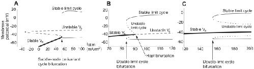 Figure 3. Bifurcation diagrams for the hippocampal neuron model.(A) A saddle node bifurcation in region C1. There are three stationary voltages in the Istim range of −40 to +50 mA/m2. The oscillations occur when the stable stationary potential Vs1 merges with a saddle point voltage Vs2. Type 1 threshold dynamics is generated if the limit cycle involves the merged point, i.e. a saddle-node bifurcation on an invariant circle (SNIC). = 20 µm/s, = 2 µm/s. (B) Subcritical Andronov-Hopf and double-limit cycle bifurcations in region B, = 20 µm/s, = 10 µm/s. The oscillations emerge at Istim = 84 mA/m2, thus when the corresponding stationary point/voltage still is stable. The loss of stability is due to a double-limit cycle bifurcation, characterized in the variable space by the simultaneous appearance of two limit cycles of opposite stability, one yielding stable and persistent oscillations. This bifurcation is not detectable by the Jacobian matrix of the stationary point; instead the bifurcation depends on the global properties of the variable space. The local Andronov-Hopf bifurcation (also named degenerate Andronov-Hopf bifurcation because of the way the limit cycles collapse onto the equilibrium point [21], [29]) occurs at Istim = 92 mA/m2. There is also an additional Andronov-Hopf bifurcation at higher Istim (524 mA/m2, now shown) that terminates the oscillations. (C) For higher values of (region A2) these two Andronov-Hopf points collide and disappear (the non-transversal Andronov-Hopf bifurcation), after which no Andronov-Hopf points are present = 20 µm/s, = 20 µm/s.