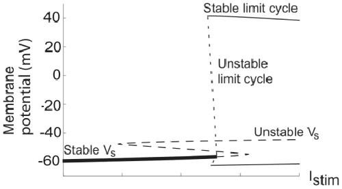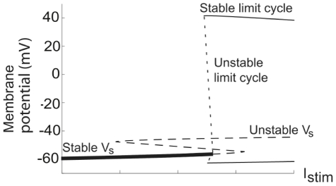 Figure 6. A Andronov-Hopf bifurcation within region C1.Schematic bifurcation diagram showing a subcritical Andronov-Hopf bifurcation within the range of three stationary potentials. The distance between the Andronov-Hopf bifurcation and the coalescence of Vs1 and Vs2 has been extrapolated.