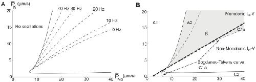 Figure 7. Revised oscillation maps for the hippocampal neuron model.Regions associated with oscillations in the − plane, showing the existence of Type 2 dynamics within region C1. (A) Onset frequencies. (B) Oscillation map for comparison with the map of Fig. 2, showing the subregions C1a and C1b. The border between C1a and C1b closely follows the Bogdanov-Takens bifurcation curve (see Table 1).