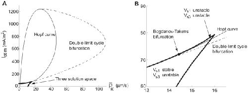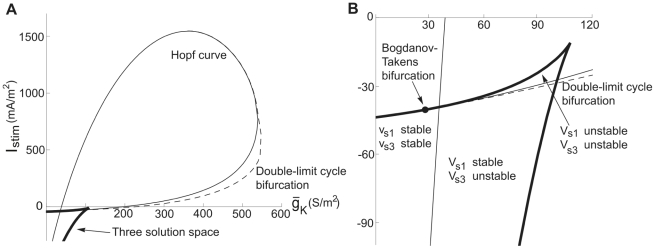 Figure 12. Bifurcation curves and the three-root solution space for the myelinated axon model.Istim− diagrams at = 1200 S/m2. The thick continuous line defines the region associated with three-root solutions of Equation 14. The thin continuous line is the Andronov-Hopf bifurcation curve and the hatched line is the double limit cycle bifurcation curve. (A) An overall perspective. (B) A detailed view of the cusp of the three-root solution space to describe the three subregions. The Bogdanov-Takens bifurcation point is marked.