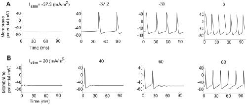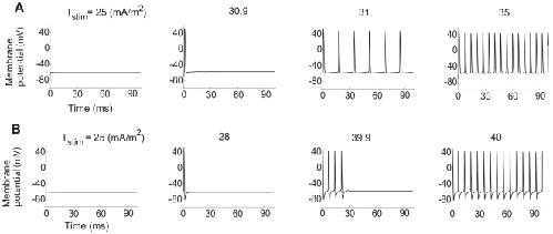 Figure 11. Exclusively Type 2 dynamics in the squid axon model.The time-course of the membrane voltage with increasing steady current for low and high K channel densities. (A) = 1200 S/m2 and = 50 S/m2. Onset frequency is 22 Hz. (B) = 1200 S/m2 and = 360 S/m2 (values used by Hodgkin and Huxley in their original study from 1952 [23]). The onset frequency is 52 Hz.