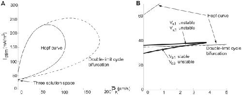 Figure 10. Bifurcation curves and the three-root solution space for the myelinated axon model.Istim− diagrams at = 200 µm/s. The thick continuous line defines the region associated with three-root solutions of Equation 14. The thin continuous line is the Andronov-Hopf bifurcation curve and the hatched line is the double limit cycle bifurcation curve. (A) An overall perspective. (B) A detailed view of the cusp of the three-root solution space to describe the subregions.