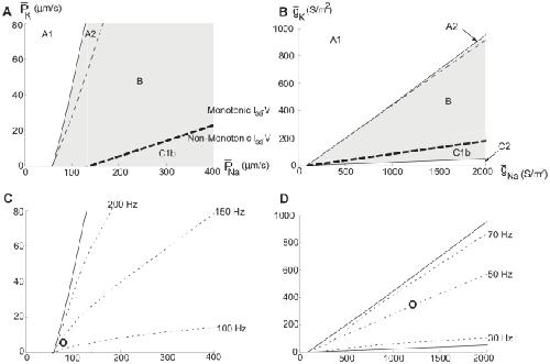 Figure 13. Oscillation maps for the axon models.Regions associated with oscillations in the − or − plane. (A) The frog myelinated axon model. (B) The squid giant axon model. As seen there is no C1a region in any of the maps and consequently both axon models lack Type 1 dynamics. Note also that the myelinated axon model (A) allows oscillations for = 0 (no K channels). (C) Onset frequency in the myelinated axon model. (D) Onset frequency in the squid axon model. Circles indicates the original values used by Hodgkin and Huxley for the model of the axon of Loligo forbesi [23] and Frankenhaeuser and Huxley for model of the sciatic nerve of Xenpus leavis [22].