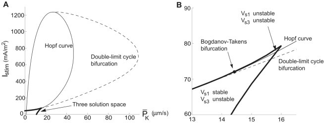 Figure 8. Bifurcation curves and the three-root solution space for the hippocampal neuron model.Istim− diagrams at = 40 µm/s. The thick continuous line defines the region associated with three-root solutions of Equation 17. The thin continuous line is the Andronov-Hopf bifurcation curve and the hatched line, defining the oscillation limit, is the double limit cycle bifurcation curve. (A) An overall perspective. (B) A detailed view of the cusp of the three-root solution space to describe the two subregions, defined by the stability of the stationary potentials. The Bogdanov-Takens bifurcation point is marked.