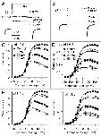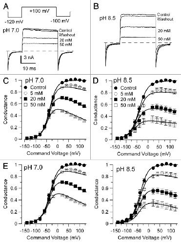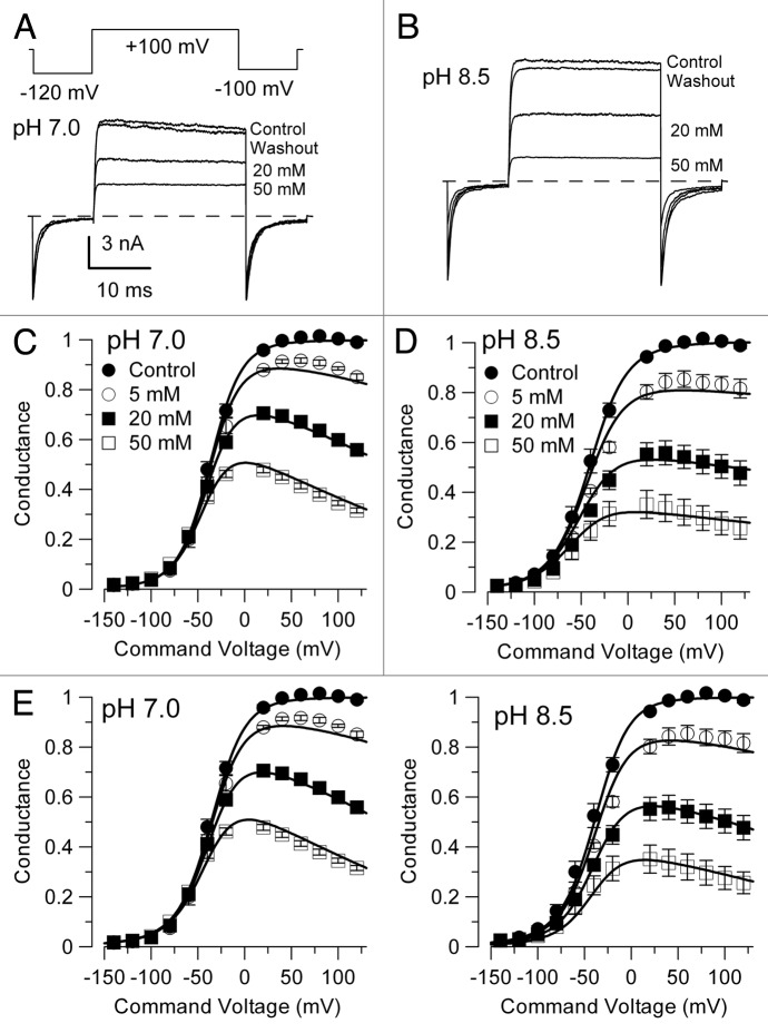 Figure 7. Comparison of block of BK currents by 4-AP at pH 7.0 and 8.5. In (A), currents activated with 300 μM Ca2+ at +100 mV by the indicated voltage protocol are compared for different 4-AP concentrations at pH 7.0. The trace for 50 mM 4-AP exhibits greater than 50% block at +100 mV with almost full and instantaneous recovery during the tail current at -100 mV. In (B), currents from the same patch as in (A) were activated as in (A) except at pH 8.5. The trace at 50 mM 4-AP shows strong block at +100 mV, with less complete recovery from block during the tail current in comparison to currents at pH 7.0. In (C and D), G-V curves at plotted for different concentrations of 4-AP either for pH 7.0 (C) or 8.5 (D). In (C), lines correspond to the best fit of Scheme 1a to all points for pH 7.0 yielding Kb = 58.3 ± 3.3 mM with zδ = 0.18 ± 0.02 e. In (D), similarly for pH 8.5, Scheme 1a yielded Kbo = 24.9 ± 2.6 mM with zδ = 0.05 ± 0.06 e. However, at pH 8.5, the state-independent Scheme 2a yielded a better fit than Scheme 1a, with Kbo= Kbc = 31.0 ± 2.7 mM with zδ = 0.11 ± 0.03 e, while for pH 7.0 Scheme 2a yielded a poorer fit than Scheme 1a. In (E), the G/V curves obtained at both pH 7.0 (left) and pH 8.5 (right) were fit simultaneously with Scheme 3, which assumes two independent 4-AP blocking sites, one for the uncharged non-protonated species defined by binding constant Kb(u) and a voltage-dependent site sensitive to protonated 4-AP defined by binding constant Kb(p). Best fit values for the three free parameters were Kb(u) = 9.07 ± 0.46 mM, Kb(p) = 63.5 ± 3.8 mM, and z(p) = 0.19 ± 0.02 e. |