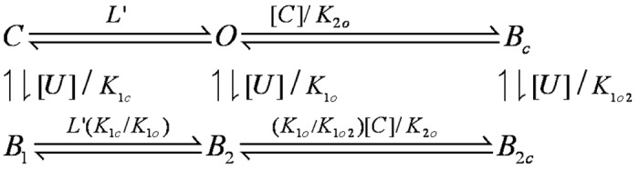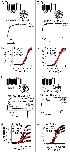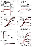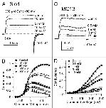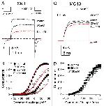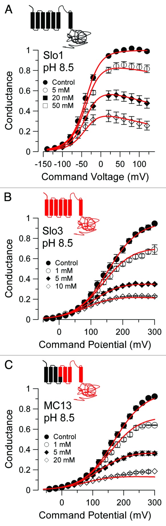 Figure 6. Cytosolic 4-AP blocks Slo3/MC13 more effectively than it blocks Slo1. In (A), G/V curves were generated for Slo1 currents activated with 300 μM Ca2+ (pH 8.5) in inside-out patches with various concentrations of 4-AP. Red lines are the best fit of Scheme 2a, the state-independent block model, with Kb = 30.7 ± 1.3 mM with zδ = 0.1 ± 0.02 e. In (B), G/V curves were generated for Slo3 currents activated with pH 8.5 and fit with Scheme 1, the open channel block model (Kb = 2.5 ± 0.5 mM with zδ = 0.02 ± 0.03 e. In (C), G/V curves were generated for MC13 currents activated in inside-out patches with pH 8.5 and fit with Scheme 1 (Kb = 2.1 ± 0.2 with zδ = 0.02 ± 0.01 e). |