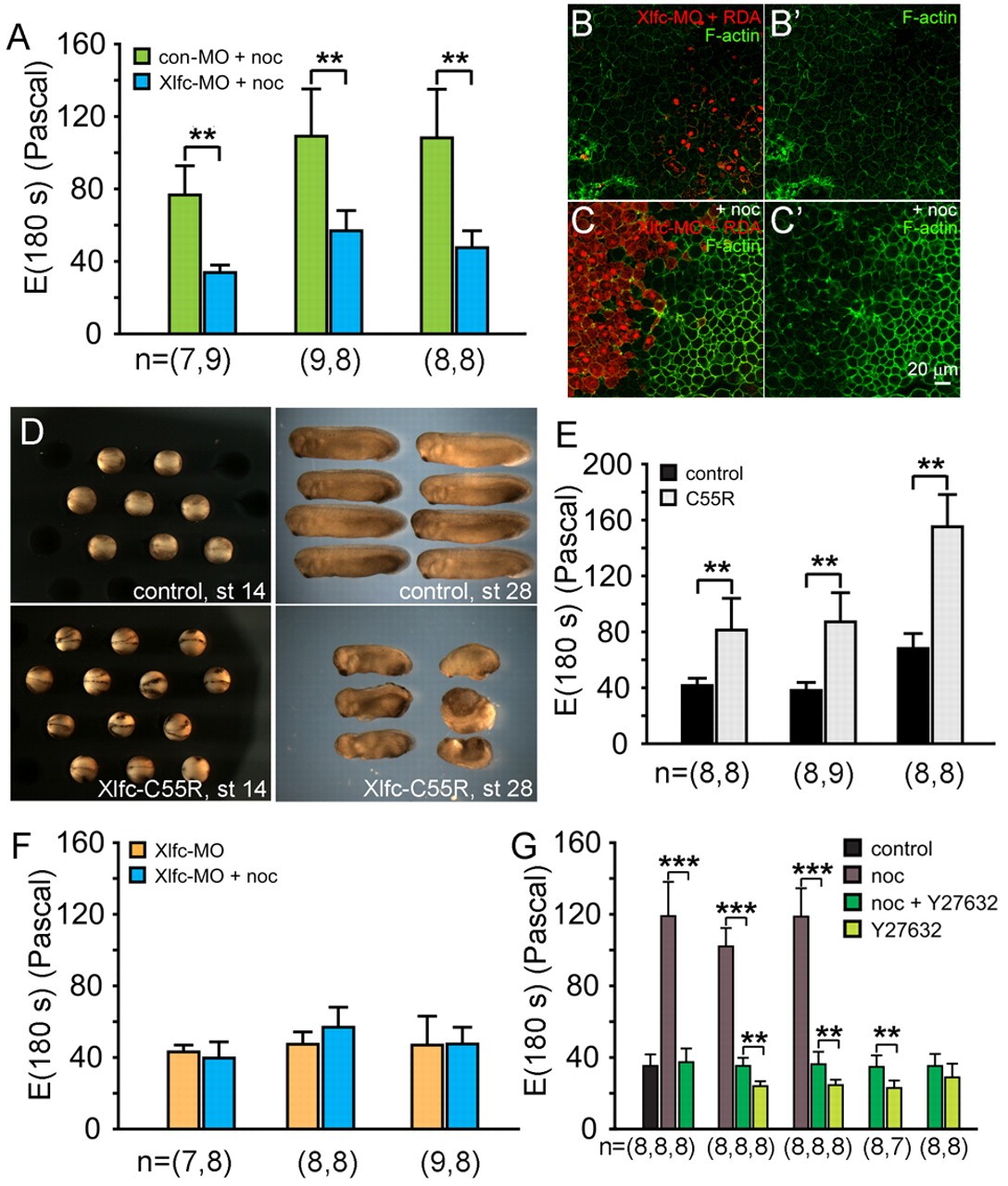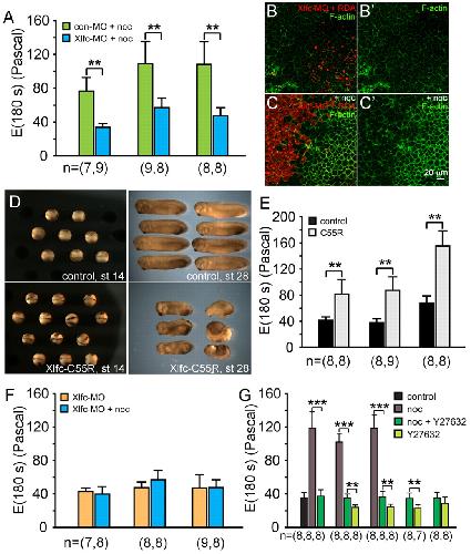 Fig. 2. Xlfc is both necessary and sufficient to stiffen dorsal isolates and induce F-actin assembly, and acts in part through Rho kinase. (A) Xlfc knock-down (Xlfc-MO) reduces nocodazole-induced stiffening of dorsal isolates. (B) Embryos with one blastomere injected at the four-cell stage with Xlfc-MO and rhodamine dextran amine (RDA) show no changes in endogenous F-actin levels. (Bâ²) F-actin levels alone in same field as in B. (C) Endogenous F-actin levels increase in the uninjected side once embryos are incubated with 50 μM nocodazole. (Bâ² and Câ² show levels of F-actin without RDA-labeled channels of B and C, respectively.) (D) Embryos expressing low quantities of the constitutively activated Xflc point-mutant Xflc-C55R close their blastopore but form dorsally shortened embryos. (E) Dorsal isolates from Xlfc-C55R-expressing embryos are twofold stiffer than controls. (F) Microtubules do not contribute to stiffness. Xlfc-MO injected embryos treated with and without nocodazole show that microtubules do not contribute directly to stiffness. (G) Nocodazole-induced stiffening is reduced by the Rho kinase inhibitor Y27632. Stiffness measurements of dorsal isolates incubated in DMSO carrier, 50 μM nocodazole, and nocodazole and 40 μM Y27632 show stiffness is restored to normal control levels after nocodazole and Y27632 are combined (P<0.01; one clutch). Stiffness of isolates from three clutches show stiffness of nocodazole-treated tissues are significantly reduced after Y27632 treatment. Additional trials from four clutches treated with both 50 μM nocodazole and 40 μM Y27632 are also significantly stiffer than those treated with Y27632 alone. Comparisons of dorsal isolate stiffness within each clutch are tested for significance using the Mann-Whitney U-test and significance of stiffness measurements among multiple clutches were calculated using one-way ANOVA (**P<0.01; ***P<0.005). |