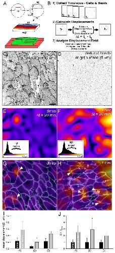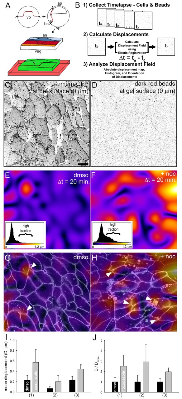 Fig. 3. Traction maps reveals nocodazole increases physical contractility of tissue. (A) Assembly of marginal zone explants on displacement-reporting polyacrylamide gels. (B) Traction maps are calculated from confocal time-lapse sequences of gel, cell and tissue movements. (C) Confocal section of mesodermal cells expressing a mem-GFP cultured on fibronectin-conjugated polyacrylamide gel. (D) Confocal section collected at the same level shows the position of dark-red fluorescent microsphere beads on the surface of the gel. (E) Traction map shows the magnitude of bead displacements beneath mesodermal cells within an intact marginal zone explant incubated in DMSO. The inset histogram shows the frequency of bead displacements and the scale of displacements. Most displacements are limited to less than 0.3 μm within the color range of purple to blue; regions of high traction above 0.3 μm are within the color ranges of red to yellow. (F) Traction map of mesodermal cells in explants incubated in 50 μM nocodazole show large displacements spread over larger areas. The histogram shows a large increase in regions of high traction. (G,H) Combined displacement maps shown in E and F, respectively, with overlying cells outlines collected from a confocal section 5 μm deeper into the cells. High regions of traction in both DMSO and after incubation in nocodazole appear to colocalize with cell-cell junctions at the mediolateral ends of cells (arrowheads). (I) Mean displacements calculated from the full field of view collected from three explants from three clutches show significant and large increases in traction after explants are incubated in nocodazole. Variances from clutch to clutch may reflect slight changes in substrate preparation or clutch-to-clutch differences in cell-generated traction. (J) Mean displacements normalized for each clutch show nocodazole consistently increases traction in all cases. |