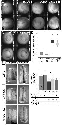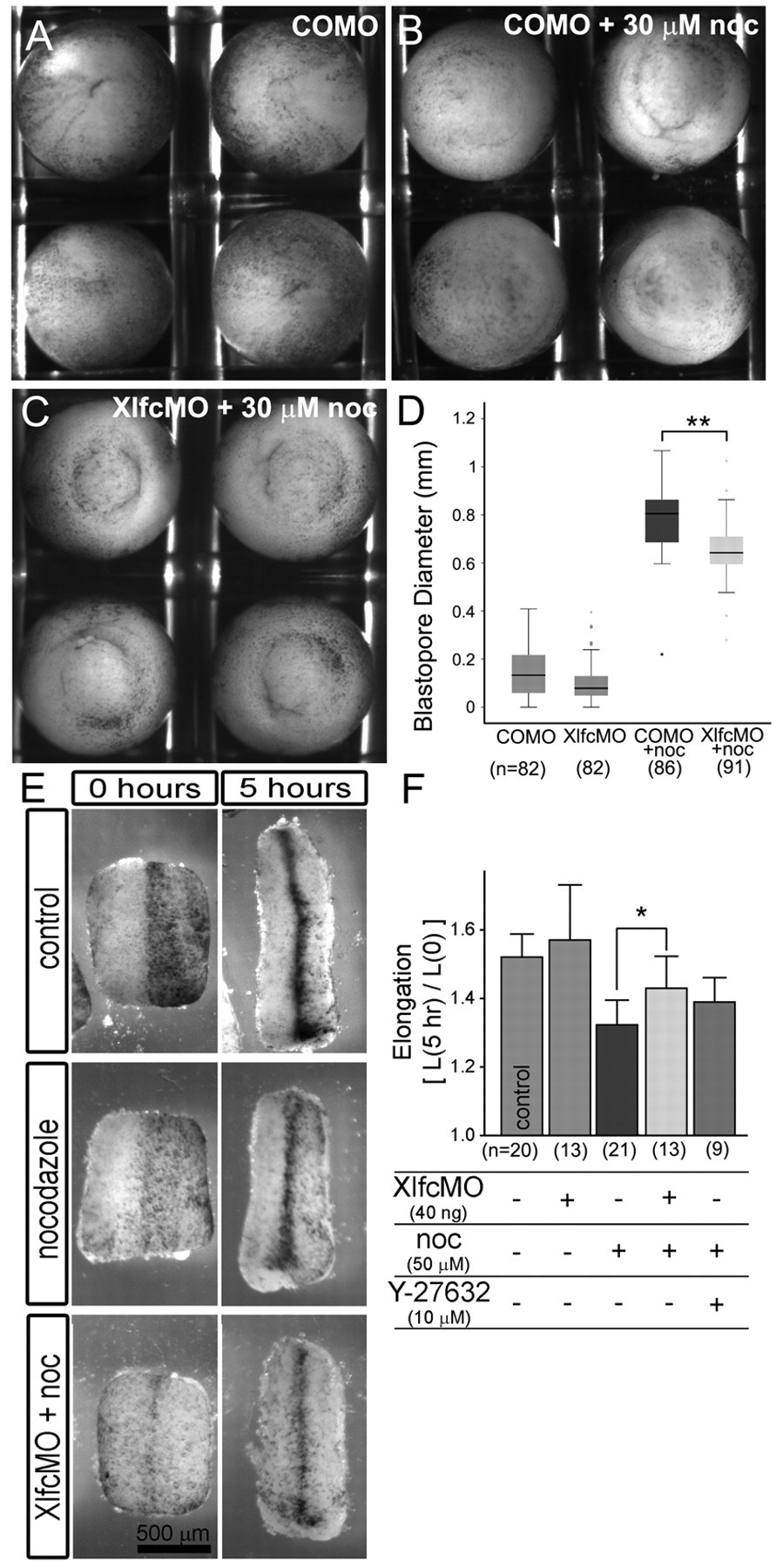 Fig. 4. Mechanical rescue of developmental defects. (A-D) Xlfc-MO produces a small but significant rescue of blastopore closure defects induced by nocodazole. (E,F) Xlfc-MO produces a moderate rescue of dorsal isolate elongation rates. (A) Embryos injected with control morpholinos close their blastopore. (B) Control morpholino-injected embryos cultured from stage 10.25 onwards in 30 μM nocodazole do not close their blastopore. (C) Embryos injected with Xlfc MO show some improvements in closing their blastopore. (D) Measurements of the diameter of the open-blastopore at stage 12.75 (just prior to closure in control embryos) show Xlfc MO provides a small but highly significant rescue of the nocodazole-induced open blastopore defect. (E) Dorsal isolates cultured from stage 13 onwards extend by nearly 50%. Incubation in 50 μM nocodazole reduces the degree of elongation, but prior injection with Xlfc MO can ameliorate that reduction. (F) Quantitative measurements of explants from three different clutches show that prior injection with XlfcMO can partly rescue the nocodazole-induced effects. By contrast, low doses of Y27632 do not provide significant rescue. |