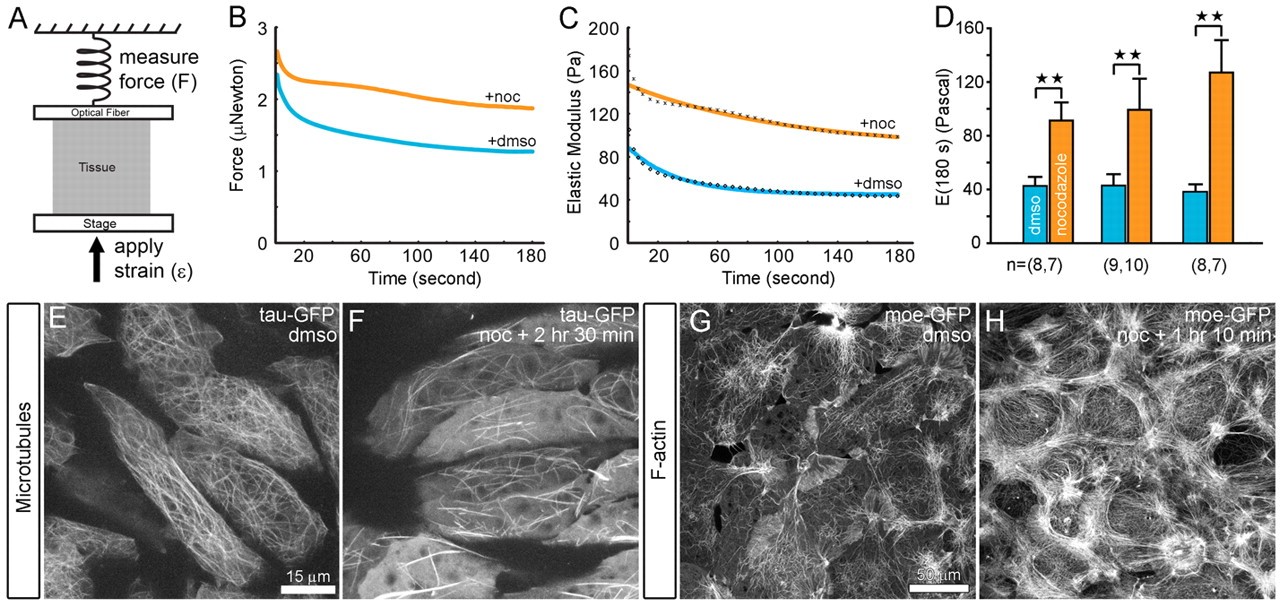 Fig. 1. Nocodazole stiffens embryonic tissues. (A) The elastic stiffness of early neural groove stage dorsal isolates (stage 16) are measured using a uniaxial unconfined compression test. (B) Representative plots of forces generated by two explants as they resist compression beginning at 0 seconds (blue line indicates explant incubated in DMSO; orange line indicates explant culture 40 minutes in 50 μM nocodazole). (C) Representative time-dependent elastic modulus of the two explants are calculated from the forces measured in B, the initial strain imposed on each isolate, and the transverse cross-sectional area of each isolate. Broken lines indicate the viscoelastic standard linear solid model fitted to the time-dependent modulus. (D) Residual elastic or Young's modulus, E(180), of 7 to 10 samples tested over three clutches or cohorts show nocodazole induces highly significant stiffening of dorsal isolates. We use the term `stiffness' for convenience when referring to E(180s). Double asterisks indicate highly significant differences (P<0.01). (E) Tau-GFP expressed in mesodermal cells in marginal zone explants reports the presence of microtubules and (F) that nocodazole reduces the amount of microtubules. (G,H) Moe-GFP expressed in mesodermal cells in marginal zone explants reports (G) the presence of F-actin and (H) that nocodazole-treatment leads to increased amounts of F-actin over the same timescale. |