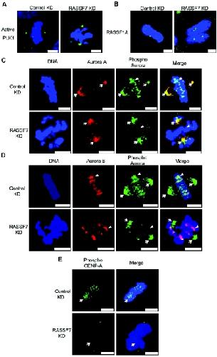 Figure 3. Analysis of mitotic signalling proteins in RASSF7-knockdown HeLa cells(A) Active PLK1 (green) appeared normal. (B) RASSF1A (green) appeared normal. (C and D) Aurora A (red, arrows) and Aurora B (red, arrowheads) appeared to localize normally. Phospho-Aurora at the centrosomes (green, arrows) appeared normal, but phospho-Aurora at the kinetochore (green, arrowheads) was reduced (9.3% of cells showed strong Aurora B staining compared with 83.8% in the controls, n=240, P<0.001) suggesting that activation of Aurora B fails. (E) Phospho-CENP-A (green, arrow) was reduced (22% of cells showed strong staining compared with 93.4% of control cells, n=210, P<0.001). Blue shows nuclear staining. Scale bars, 5 μm.