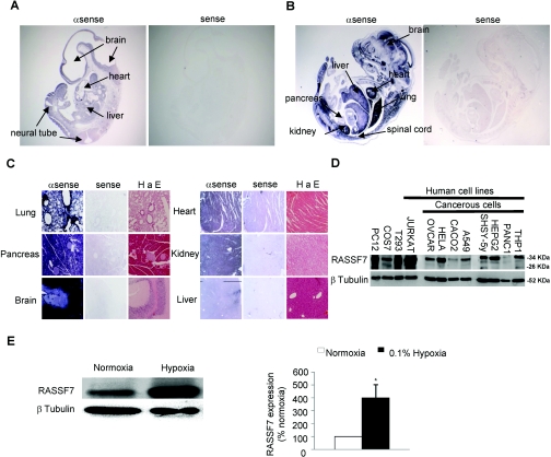 Figure 1. RASSF7 is expressed in a wide range of cell types(A) In situ hybridization on E (embryonic day) 10.5 mouse embryos (×22). (B) In situ hybridization on E15.5 mouse embryos (×8). (C) In situ hybridization on mouse adult tissues (×50). The H a E staining shows the tissue architecture. (D) Western blotting shows expression of RASSF7 protein in different mammalian cell lines. Molecular masses are indicated in kDa. (E) RASSF7 protein expression levels increased in HeLa cells exposed to hypoxic conditions. *P<0.05 compared with corresponding controls. αsense, antisense.
