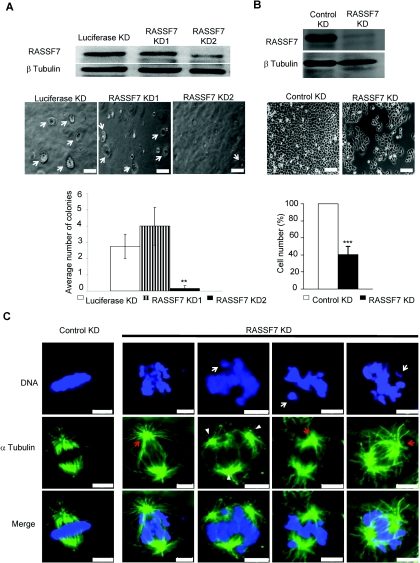 Figure 2. RASSF7 knockdown caused a reduction in cell number and defects in mitosis(A) RASSF7 siRNA oligonucleotides KD2, but not KD1, blocked RASSF7 expression and prevented H1792 cells from forming colonies (arrows). Quantification is based on the number of colonies bigger than 50 μm (**P<0.01 for RASSF7 KD2 compared with Luciferase KD and RASSF7 KD1). (B) shRNA knockdown of RASSF7 reduced HeLa cell numbers. The difference between control and RASSF7-depleted cells was 2.6±0.6-fold (***P<0.001), based on five independent experiments. This was not due to variations in the selection process as it was observed when cells were selected, replated at the same density and then allowed to grow (1.9±0.4-fold reduction). (C) RASSF7-knockdown HeLa cells exhibit defects in spindle formation (red arrows highlight the more radial microtubules) and chromosomal congression, with an increase in cells which had failed to align their DNA (63% compared with 18% in controls, n=300, P<0.01) and an increase in cells with lagging chromosomes (21.5% compared with 6% in controls, n=300, P<0.01, white arrows). There was also a small increase in tripolar spindles (32.6% compared with 23.7% in controls, n=300, P<0.05, arrowheads). Scale bars, 100 μm (A and B) and 5 μm (C).