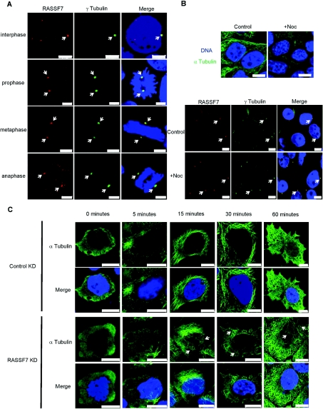 Figure 4. RASSF7 localizes to the centrosome and knocking down its expression causes defective microtubule regrowth in HeLa cells(A) Co-localization of RASSF7 with the centrosomal marker γ-tubulin (arrows). (B) Microtubules (α-tubulin/green) were disrupted by treatment with nocodazole (300 ng/ml) for 1 h at 37 °C (top panels). This did not affect RASSF7 localization at the centrosomes which were stained for γ-tubulin (arrows, bottom panels). (C) Microtubule-regrowth assay. Microtubules were disrupted with nocodazole (300 ng/ml) for 1 h and subsequent regrowth was monitored at different time points. RASSF7 knockdowns had fewer microtubules (after 15 and 30 min) and more bent microtubules (arrows). Quantification showed that, after 15 min, 53% of knockdown cells had a delay in regrowth compared with 14% of controls (n=100, P<0.001). Blue shows nuclear staining. Scale bars, 5 μm (A) and 10 μm (B and C).