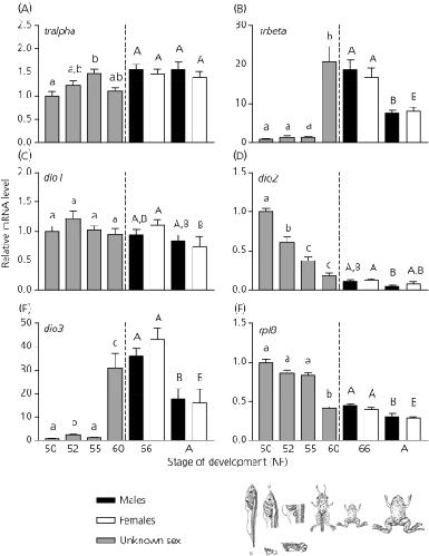 Fig. 1. Brain developmental profiles of thyroid hormone-related genes during Silurana tropicalis metamorphosis and adulthood. Transcript levels of tralpha (a), trbeta (b), dio1 (c), dio2 (d) and dio3 (e) were measured in whole brain from Nieuwkoop and Faber (NF) stage 50 until adulthood. Levels of mRNA are expressed relative to NF 50 and are normalised to RNA content. Results for the reference gene ribosomal protein L8 (rpl8; f) are also presented. Bars represent the mean ± SEM. Different letters indicate statistically significant differences between stages (n = 5–8 pools; P<0.05). Brain samples for NF 66 and adulthood were statistically analysed separately from NF 52–60 samples (for details, see Materials and methods). Main morphological characteristics (i.e. whole body and hind limb diagrams) are included for each NF stage of development. Note that the scales of the y-axis vary between genes. A, adult.