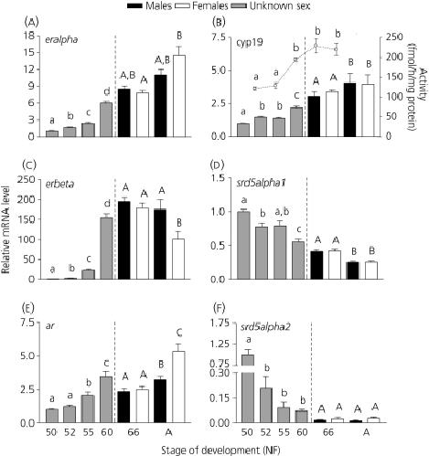 Fig. 2. Brain developmental profiles of sex steroid-related genes during Silurana tropicalis metamorphosis and adulthood. Transcript levels of eralpha (a), cyp19 mRNA and activity (b) erbeta (c), srd5alpha1 (d), ar (e) and srd5alpha2 (f) were measured in whole brains from Nieuwkoop and Faber (NF) stage 50 until adulthood (y-axis on the left). Levels of mRNA are expressed relative to NF 50 and are normalised to RNA content. Enzyme activity for cyp19 (b) was measured from NF 52–66 (y-axis on the right) and is expressed in fmol/h normalised to protein content. Bars represent the mean ± SEM. Different letters indicate statistically significant differences between stages (n = 5–8 pools; P<0.05). Brain samples for NF 66 and adulthood were statistically analysed separately from NF 52 to NF 60 samples (for details, see Materials and methods). Significant differences in enzyme activity levels are indicated by small letters (n = 5–6; P<0.05). Note that the scales of the y-axis vary between genes. A, adult.