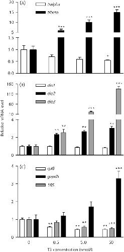 Fig. 3. Effects of triiodothyronine (T3) exposure on the expression of thyroid hormone-related genes in Silurana tropicalis premetamorphic tadpoles. Silurana tropicalis (Nieuwkoop and Faber stage 52–54) were exposed to T3 (0, 0.5, 5, 50 nm) for 48 h. Effects of T3 on tralpha and trbeta (a), dio1, dio2 and dio3 (b) and the reference genes rpl8, gapdh and 18S (c) are presented. Data are presented as the fold changes relative to control and are normalised to RNA content (note the broken y-axis for a and b). Bars represent the mean ± SEM. Asterisks represent significant differences from the control group (n = 8 pools; *P<0.05; **P<0.01; ***P<0.001). Note that the scales of the y-axis vary between genes.