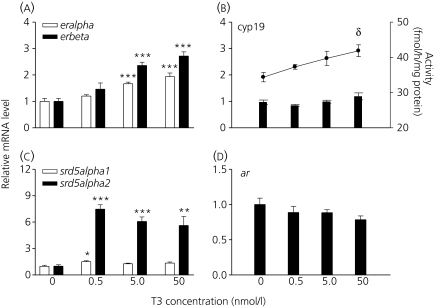 Fig. 4. Effects of triiodothyronine (T3) exposure on the expression of sex steroid-related genes in Silurana tropicalis premetamorphic tadpoles. Silurana tropicalis (NF 52–54) were exposed to T3 (0, 0.5, 5, 50 nm) for 48 h. Effects of T3 on eralpha and erbeta (a), cyp19 mRNA and activity (b), srd5alpha1 and srd5alpha2 (c) and ar (d) are presented. Gene expression data (y-axis on the left) are presented as the fold changes relative to control and are normalised to RNA content. Enzyme activity (y-axis on the right; b) is expressed in fmol/h normalised to protein content. Bars represent the mean ± SEM. Asterisks represent significant differences in gene expression levels from the control group (n = 8 pools; *P<0.05; **P<0.01; ***P<0.001). Significant differences in enzyme activity levels are indicated by delta (δ; n = 5; P<0.01) relative to the control group. Note that the scales of the y-axis vary between genes.