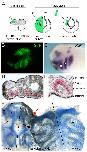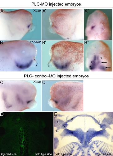Fig. S4. Xbap and XHand2 expression is downregulated on the injected side of PLC morphants. (A-C′) The injected side of each embryo, visualized by n-β-gal staining (red), is always on the right. (A,A′,B,B′) Lateral view of stage 37 PLC morphants hybridized with Xbap (A,A′) and XHand2 (B,B′) probes. (A′′,B′′) Frontal view of the embryos in A,A′ and B,B′, respectively. (C,C′) Lateral views of a stage 37 embryo injected with PLC-control-MO and hybridized with the Xbap mRNA probe. There are no differences in the Xbap expression on the wild-type (C) and injected (C′) sides of the embryo. (D) Dorsal view of a PLC morphant. The left, injected side is visualized by GFP fluorescence. (E) Flat-mount preparation of the embryo in D stained with Alcian Blue. Note that the injected side of the embryo is normal. |