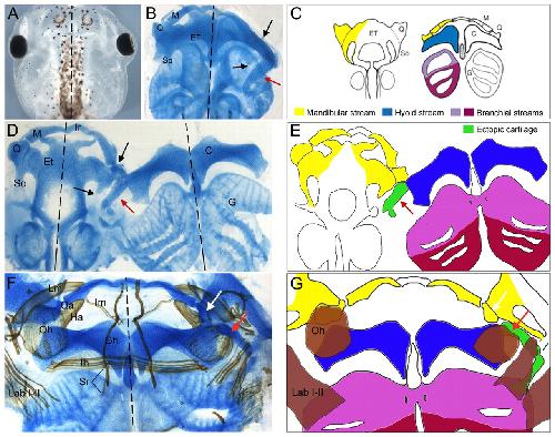 Fig. 1. Skeletal and muscular alteration in 5-HT2B-overexpressing tadpoles (stage 49). (A) Dorsal view of a 5-HT2B-overexpressing embryo. (B,D) Alcian Blue-stained whole-mount (B) and flat-mount (D) skeleton of injected embryos. Red arrows indicate the ectopic cartilage and black arrows indicate the reduction of the quadrate (Q) and subocular (So) cartilages. (C,E) Scheme of the contribution of cranial NCC streams to the neurocranium and pharyngeal skeleton of Xenopus laevis as reported by Pasqualetti et al. (Pasqualetti et al., 2000) (C) and in 5-HT2B-overexpressing embryos (E). (F) Flat-mount of an injected embryo double stained for cartilage (blue) and muscles (brown). (G) Scheme of muscular alterations of the 5-HT2B-overexpressing embryo shown in F. On the injected side, the orbitohyoideus muscle (Oh) is anchored to the ectopic cartilage (red arrow in F,G) instead of to the reduced quadrate (white arrow in F,G). Note the disorganization of the levatores arcuum branchialum muscles I-II (Lab I-II) on the injected side. C, ceratohyal; Et, ethmoidal plate; G, genohyoideus; Ha, hyoangularis; Ih, interhyoid muscle; Im, intermandibular; Ir, infrarostral; M, Meckel's; Qa, quadratoangularis; Lm, levator mandibulae; Sr, subarcuales rectus. |