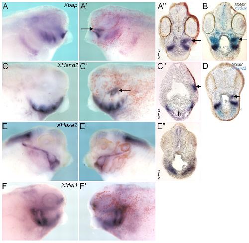 Fig. 3. 5-HT2B overexpression results in ectopic Xbap and XHand2 mRNA expression. The injected side, visualized by n-β-gal staining (red), is always on the right. Lateral view (A,Aâ²,C,Câ²,E,Eâ²,F,Fâ²) and vibratome sections (Aâ²,B,Câ²,D,Eâ²) of stage 37 Xenopus embryos. (A-Aâ²) Xbap mRNA ectopic expression in the mandibular arch (arrow in Aâ²,Aâ²). (B) Double ISH showing Xbap ectopic expression (dark blue) in a subdomain (arrow) of the XSox9-expressing cells (light blue). (C-Câ²) XHand2 ectopic expression in the dorsal domain of the posterior branchial arches (arrow in Câ²,Câ²). (D) Double ISH showing Xbap (dark blue) and XHand2 (light blue). On the injected side, only Xbap is ectopically expressed in the mandibular arch (arrow). (E-Eâ²) XHoxa2 expression in the second branchial arch is normal. (F,Fâ²) XMel1 expression in third and fourth branchial arches is normal. h, heart. |