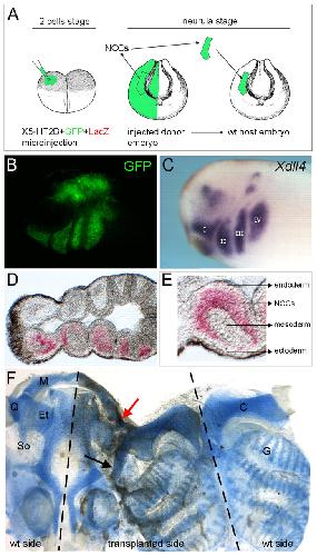 Fig. 4. 5-HT2B influences cranial NCC development in a cell-autonomous manner. (A) Scheme of the cranial NCC transplantation assay. (B,C) Lateral view of stage 30 transplanted and wild-type embryos, respectively. (B) GFP fluorescence in transplanted cranial NCCs. (C) Cranial NCCs visualized by the XDll4 probe in a wild-type embryo. (D,E) Horizontal vibratome sections of Xenopus tadpole. The red staining identifies transplanted NCCs. (E) Magnification of the second pharyngeal arch of a transplanted embryo stained for n-β-gal. (F) Flat-mount preparation of a stage 49 transplanted embryo double stained for cartilage (blue) and GFP immunoreactivity (brown). Skeletal elements derived from the transplanted cranial NCCs are visualized by the presence of GFP immunoreactivity. Note the reduced quadrate (red arrow) and the presence of ectopic cartilage (black arrow). |