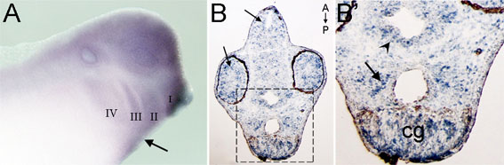 Fig. S1. 5-HT2B mRNA expression in migrated cranial NCCs. In situ hybridization with the 5-HT2B probe. (A) Lateral view of a wild-type stage 28 Xenopus embryo. 5-HT2B mRNA is expressed in NCCs that have migrated into the four branchial arches and in the heart primordia (arrow). (B) Cryostat coronal section of a wild-type stage 37 embryo. 5-HT2B mRNA is present in scattered cells of the retina and of the neural tube (arrows). (B′) Magnification of the region highlighted in B. 5-HT2B mRNA is expressed in the cement gland (cg), in the ventricular region of the ventral diencephalon (arrowhead) and in the region surrounding the oral cavity (arrow). |