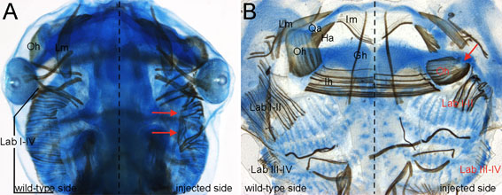 Fig. S2. Muscular alterations in 5-HT2B-overexpressing tadpoles (stage 49). (A,B) 5-HT2B-overexpressing embryos double stained for cartilage (blue) and muscle (brown) in whole-mount (dorsal view, A) and flat-mount (B) preparations. Note the muscular alterations on the injected side of the embryo: the levatores arcuum branchialum muscles I-II (Lab I-II) are disorganized (red arrows in A) and the orbitohyoideus muscle (Oh) is anchored to the ectopic cartilage (red arrow in B) instead of to the reduced quadrate, as on the wild-type side. |