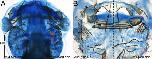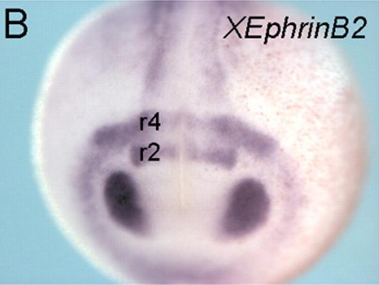 Anterior view of a late neurula stage Xenopus embryo, showing gene expression for efnb2 (ephrin B2), assayed via in situ hybridization, in rhombomere r2 and rhombomere r4, as well as eye primordium (optic field). |