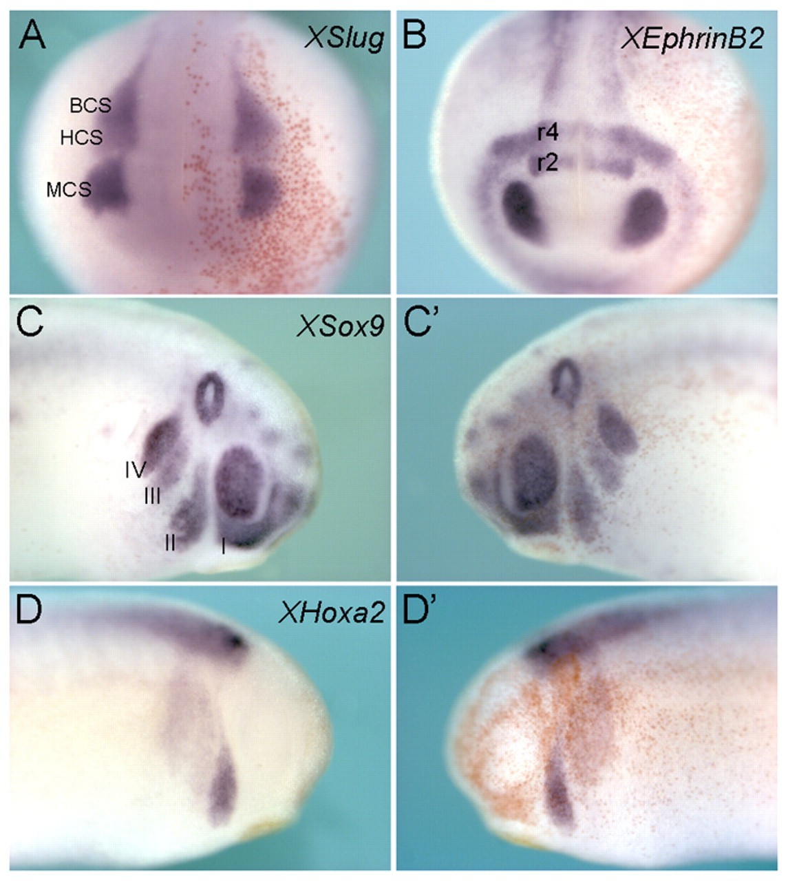 Fig. 2. 5-HT2B overexpression does not influence NCC specification and migration. The injected side, visualized by n-β-gal staining (red), is always on the right. (A,B) Frontal view of a neurula stage Xenopus embryo hybridized with XSlug (A) and XEphrinB2 (B) probes. (C-Dâ²) Lateral view of tailbuds hybridized with XSox9 (C,Câ²) and XHoxa2 (D,Dâ²) probes. MCS, mandibular crest stream (branchial arch I); HCS, hyoid crest stream (branchial arch II); BCS, branchial crest stream (branchial arches III-IV). |