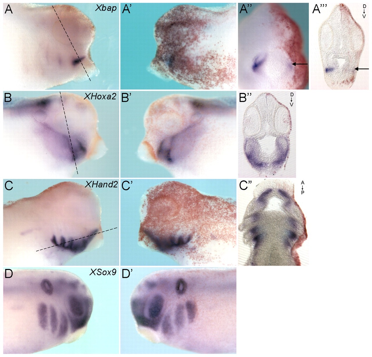 Fig. 7. 5-HT2B loss of function results in the downregulation of Xbap expression in postmigratory NCCs. The injected side, visualized by n-β-gal staining (red), is always on the right. (A,Aâ²,B,Bâ²,C,Câ²) Lateral view of stage 37 Xenopus embryos hybridized with Xbap (A,Aâ²), XHoxa2 (B,Bâ²) and XHand2 (C,Câ²) probes. (Aâ²) Frontal view of the embryo in A. (Aâ²â²â²,Bâ²,Câ²) Vibratome coronal sections across the line in A, B and C, respectively. (A-Aâ²â²â²) The Xbap expression is reduced on the injected side of stage 37 5-HT2B morphants (arrows in Aâ², Aâ²â²â²) as compared with the control side. XHoxa2 (B-Bâ²) and XHand2 (C-Câ²) expression is unaffected. (D,Dâ²) Lateral view of a whole-mount stage 28 5-HT2B morphant hybridized with XSox9 probe. |