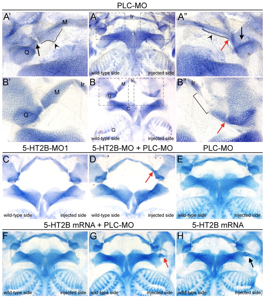 Fig. 8. Phospholipase C beta 3 acts downstream of 5-HT2B to regulate the jaw joint formation. Flat-mount preparations of Alcian Blue-stained injected Xenopus embryos. (A-Bâ²) PLC-MO morphants. (Aâ²,Aâ²,Bâ²,Bâ²) Magnification of the jaw joint region of the embryos in A,B. Note the lack of the jaw joint (red arrow in Aâ²,Bâ²) and of the ventral cartilaginous muscular process of the Meckel's (arrowhead in Aâ²), as compared with the control side (arrowhead in Aâ²). (Bâ²) A strong phenotype PLC morphant presenting the loss of the jaw joint (arrow) and of the distal portion of the Meckel's (squared bracket). (C,E) Embryos injected with subthreshold levels of either 5-HT2B-MO (C) or PLC-MO (E) develop a normal visceral skeleton. (D) The co-injection of subthreshold levels of 5-HT2B-MO plus PLC-MO causes loss of the jaw joint (red arrow). (F,G) The co-injection of PLC-MO together with 5-HT2B mRNA results in 79% normal embryos (F) and 21% presenting the ectopic cartilage (G). (H) In 5-HT2B overexpression embryos, the ectopic cartilage is always bigger than that originating in the 5-HT2B mRNA+PLC-MO injected embryos (compare red arrow in G to black arrow in H). |