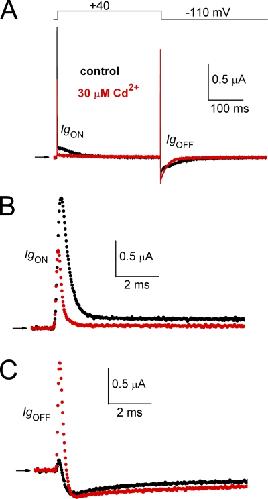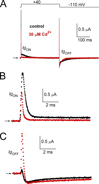 Figure 3. Cd2+ reduces the fast and slow components of IgON and induces the appearance of ICd-out, a brief initial outward component that precedes IgOFF. (A) Superimposed traces for gating currents measured before and after treatment of an oocyte with 30 µM Cd2+. Top panel shows pulse protocol. (B) IgON shown on an expanded time scale. (C) IgOFF shown on an expanded time scale. |