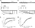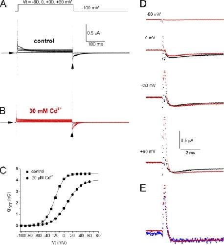 Figure 4. Gating currents measured without using p/−8 leak and capacitance current subtraction. (A) Unsubtracted currents recorded under control ionic conditions using pulse protocol illustrated in top panel. (B) Unsubtracted currents for the same oocyte in the presence of 30 µM Cd2+. (C) QOFF-V relationships for gating currents recorded in the absence and presence of 30 µM Cd2+. Data were fitted to a Boltzmann function (smooth curves). In control conditions, V1/2 = −22.1 mV and z = 2.29. In the presence of Cd2+, V1/2 = +7.8 mV and z = 1.52. (D) Superimposed traces of unsubtracted IgOFF for control (black traces) and 30 µM Cd2+ (red traces) at −110 mV after activating pulses were applied to the indicated Vt. (E) Superimposed traces for p/−8 subtracted (blue) and unsubtracted currents (red) in the presence of 30 µM Cd2+ for a Vt of +60 mV. Note that ICd-out is approximately the same, indicating that it is not an artifact of the on-line leak subtraction protocol. |
