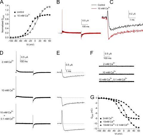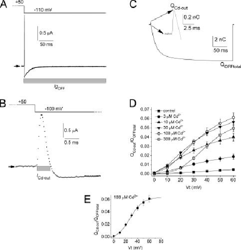 Figure 5. Effect of [Cd2+]e on the magnitude of ICd-out. (A) IgOFF in the presence of 30 µM Cd2+. Arrows indicate zero current level. Gray bar indicates region of IgOFF integrated to obtain total QOFF. (B) ICd-out shown in A, plotted on an expanded time scale. Gray bar indicates the region of IgOFF integrated to obtain QCd-out. (C) Integral of IgOFF. Inset shows QOFF at greater resolution. (D) Plot of QCd-out/QOFF total as a function of Vt and [Cd2+]e. Also shown is a plot of QCd-out versus Vt for control conditions. (E) Plot of QCd-out/QOFF total as a function of Vt for 100 µM Cd2+ and fitted to a Boltzmann function (smooth curve): V1/2 = 27 mV; slope factor = 11.0 mV; maximum value of QCd-out/QOFF total = 0.064. |
