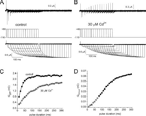 Figure 6. Kinetics of QOFF. (A) Gating currents elicited under control conditions. Top panel is a plot of gating currents in response to voltage pulse protocol shown in the middle panel. Bottom panel shows the first integral of IgOFF traces depicted in top panel. (B) Gating currents, pulse protocol, and integration of currents are shown for the same oocyte after bath application of 30 mM Cd2+. (C) Plot of total QOFF versus pulse duration determined before (filled squares) and after treatment of an oocyte with Cd2+ (open circles). Smooth curves are best fits for single-exponential function (τ = 29 ms for control; τ = 100 ms for Cd2+). (D) Plot of QCd-out in the presence of 30 µM Cd2+ versus pulse duration. Data for pulse durations >70 ms (filled circles) were fitted with a single-exponential function (τ = 95 ms). Thus, after accounting for a delay caused by overlap of the faster rising phase of IgOFF for short pulse durations, the time course of the development of QCd-out matches that of QOFF. |