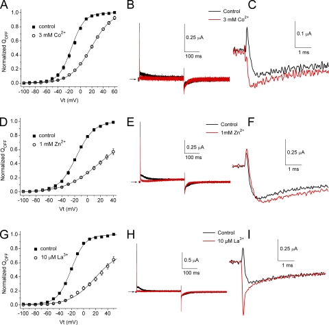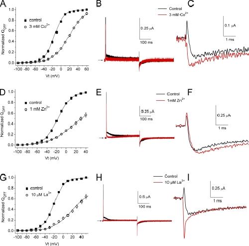 Figure 8. Co2+, Zn2+, and La3+ cause a positive shift in the voltage dependence of QOFF-V relationships for hERG1, but they do not induce a transient outward component in IgOFF. (A) QOFF-V relationships for hERG1 measured under control conditions ([Ca2+]e = 2 mM) and after the addition of 3 mM Co2+ (n = 3). Control: V1/2 = −15.9 ± 0.8 mV and z = 2.20 ± 0.08; Co2+: V1/2 = 19.1 ± 0.9 mV and z = 1.34 ± 0.02. (B) Ig traces recorded in the presence of 2 mM Ca2+ (control) and 3 mM Co2+ at a test potential of +60 mV. IgOFF was measured at −110 mV. (C) IgOFF traces from B are shown at expanded time (initial 5 ms) and amplitude scales. (D) QOFF-V relationships for hERG1 measured under control conditions ([Ca2+]e = 2 mM) and after the addition of 1 mM Zn2+ (n = 3). Control: V1/2 = −17.5 ± 0.3 mV and z = 1.82 ± 0.03; Zn2+: V1/2 = 16.4 ± 6.3 mV and z = 0.97 ± 0.06. (E) Ig traces recorded in the presence of 2 mM Ca2+ (control) and 1 mM Zn2+ at a test potential of +60 mV. IgOFF was measured at −110 mV. (F) IgOFF traces from E are shown at expanded time (initial 5 ms) and amplitude scales. (G) QOFF-V relationships for hERG1 measured under control conditions ([Ca2+]e = 2 mM) and after the addition of 10 µM La3+ (n = 3). Control: V1/2 = −20.6 ± 0.4 mV and z = 2.18 ± 0.06; La3+: V1/2 = 19.3 ± 3.9 mV and z = 1.23 ± 0.08. (H) Ig traces recorded in the presence of 2 mM Ca2+ (control) and 10 µM La3+ at a test potential of +60 mV. IgOFF was measured at −110 mV. (I) IgOFF traces from H are shown at expanded time (initial 5 ms) and amplitude scales. |