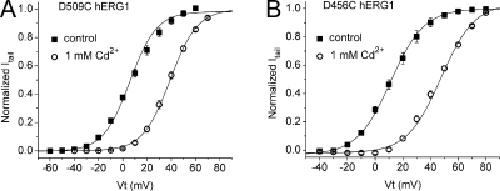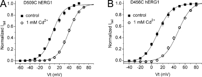 Figure 9. Extracellular Cd2+ induces positive shifts in the G-V relationships of D509C and D456C hERG1 channels. (A and B) G-V relationships for D509C hERG1 (A; n = 6) and D456C hERG1 (B; n = 5) channel currents in the absence (control) and presence of 1 mM extracellular Cd2+. |