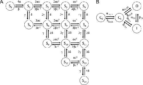 Figure 13. Schematics of Markov model for gating and ionic currents of WT hERG1 channels. The model consists of two components, one for voltage sensing with the states S0 to S14 (A) and the other for activation and inactivation with the states C0, C1, O, and I (B). The coupling between the components is via the rate coefficient αC0,C1, which is a function of the states S4, S8, S11, S13, and S14 in the component for voltage sensing. |