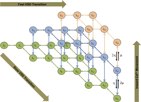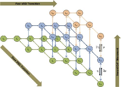 Figure 17. Schematics of Markov model for Ig of WT hERG1 channels in the presence of extracellular Cd2+. The model extends the description of Ig in Fig. 13 A with states and transitions describing the movement of Cd2+. States S0 to S14 (green) describe hERG1 configurations with Cd2+ bound to a site in the VSD. States S15 to S24 (blue), and S25 to S30 (brown), are associated with hERG1 configurations having one and two Cd2+ ions moved in the VSD, respectively. |
