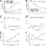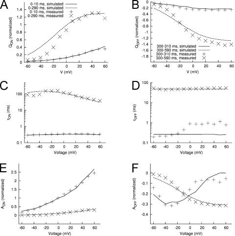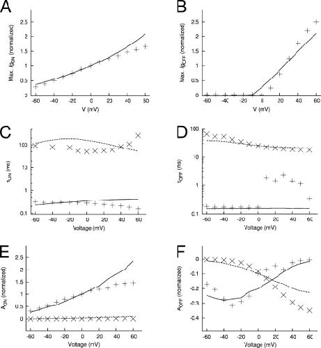Figure 18. Features of measured and modeled Ig in the presence of extracellular Cd2+. (A) Maximal IgON-Vt relationship. (B) Maximal IgOFF-Vt relationship. Time constants–Vt relationships for IgON (C) and IgOFF (D). Relationship of exponential fit coefficients to Vt for IgON (E) and IgOFF (F). |