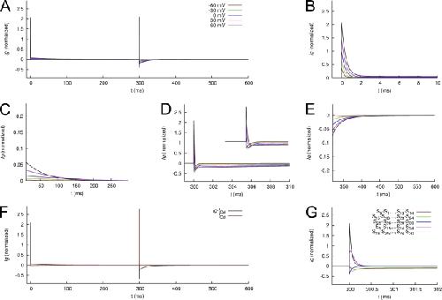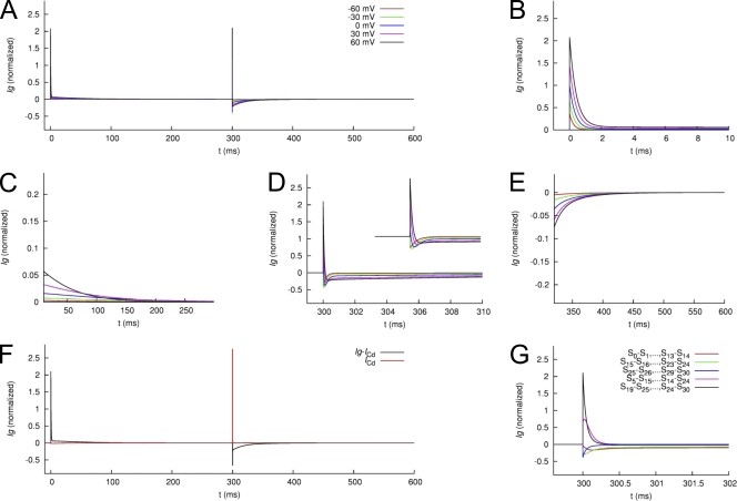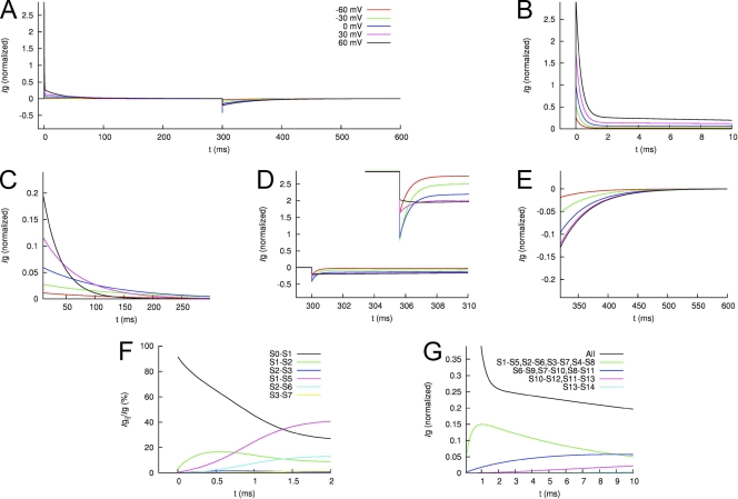Figure 15. Modeled Ig of WT hERG1 channels. (A) Ig in response to the voltage-clamping protocol used in Fig. 12. (B and C) IgON at 0–10 ms and 10–300 ms, respectively. (D and E) IgOFF at 300–310 ms and 310–600 ms, respectively. (F) The initial phase (0–1 ms) of IgON is primarily carried by the fast transition between S0 and S1. (G) The slow decay of IgON between 2 and 10 ms is caused by a mixture of increasing and decreasing gating currents associated with the slow transitions in the gating model. |