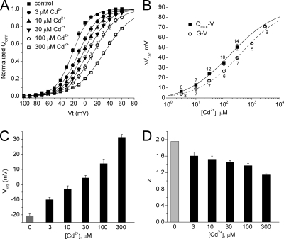 Figure 2. Extracellular Cd2+ shifts the Q-V relationship for hERG1 to more positive potentials. (A) Normalized QOFF is plotted as a function of Vt and [Cd2+]e. Averaged data for control and each [Cd2+]e were fitted to a Boltzmann function (smooth curves). (B) Plot of change in V1/2 for Q-V and G-V relationships as a function of [Cd2+]e. Data were fitted to a Hill equation to determine EC50 and Hill coefficient (nH). ΔV1/2max was set at +90 mV (Fernandez et al., 2005). For Q-V relationship, EC50 = 171 ± 13 µM; nH = 0.53 ± 0.03. For G-V relationship, EC50 = 416 ± 20 µM; nH = 0.57 ± 0.02. The number of oocytes used to calculate the average data is indicated next to each data point. (C) [Cd2+]e-dependent effects on V1/2 for Q-V relationship. (D) [Cd2+]e-dependent effects on effective valence, z, of Boltzmann function for Q-V relationship. For A, C, and D, the number of oocytes was as follows: control, 20; 3 µM Cd2+ , 8; 10 µM Cd2+, 7; 30 µM Cd2+, 12; 100 µM Cd2+, 10; 300 µM Cd2+, 14. |