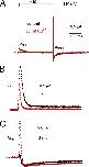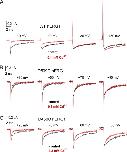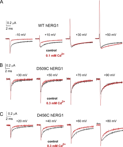 Figure 10. Cd2+ enhances ICd-out of WT but not D509C or D456C hERG1 channels. (A) Traces for initial 10 ms of IgOFF of WT hERG1 channels elicited by return of membrane potential to −110 mV from the indicated Vt. (B and C) Traces for initial 10 ms of IgOFF of D509C (B) or D456C hERG1 (C) hERG1 channels elicited by return of membrane potential to −110 mV from the indicated Vt. Current traces for mutant channels are aligned below the traces for WT channels to facilitate comparisons based on measured shifts in the V1/2 for activation of ionic currents. For all panels, black traces represent control currents, and red traces represent currents after treatment of an oocyte with 0.1 mM (WT channels) or 0.3 mM (mutant channels) CdCl2. |