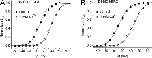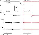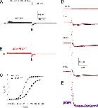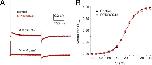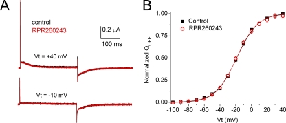Figure 11. RPR260243 has no effect on hERG1 channel gating currents. (A) Gating currents for WT hERG1 channels measured at test potentials of −10 and +40 mV before (black traces) or 25 min after exposure of an oocyte to 30 µM RPR260243 (red traces). For these experiments, the currents were filtered at 5 kHz and digitized at 20 kHz. (B) Average QOFF-V relationships determined under control conditions and after the treatment of the same oocytes with 30 µM RPR260243 for 20–25 min (n = 5). QOFF was normalized to the peak of the control value for each oocyte. Data were fitted with a Boltzmann function (smooth curves). In control conditions, V1/2 = −18.6 ± 0.5 mV and z = 1.84 ± 0.01. In the presence of RPR260243, V1/2 = −19.0 ± 0.5 mV and z = 1.88 ± 0.01. |