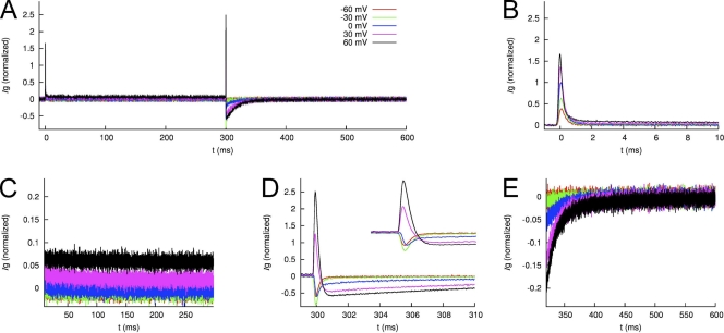Figure 12. Averaged and normalized Ig of WT hERG1 channels measured using p/−8 leak and capacitance current subtraction. (A) Ig in response to test voltages Vt of −60, −30, …+60 mV during 0–300 ms. The membrane voltage is clamped to −110 mV otherwise. (B and C) IgON at 0–10 ms and 10–300 ms, respectively. (D and E) IgOFF at 300–310 ms and 310–600 ms, respectively. |